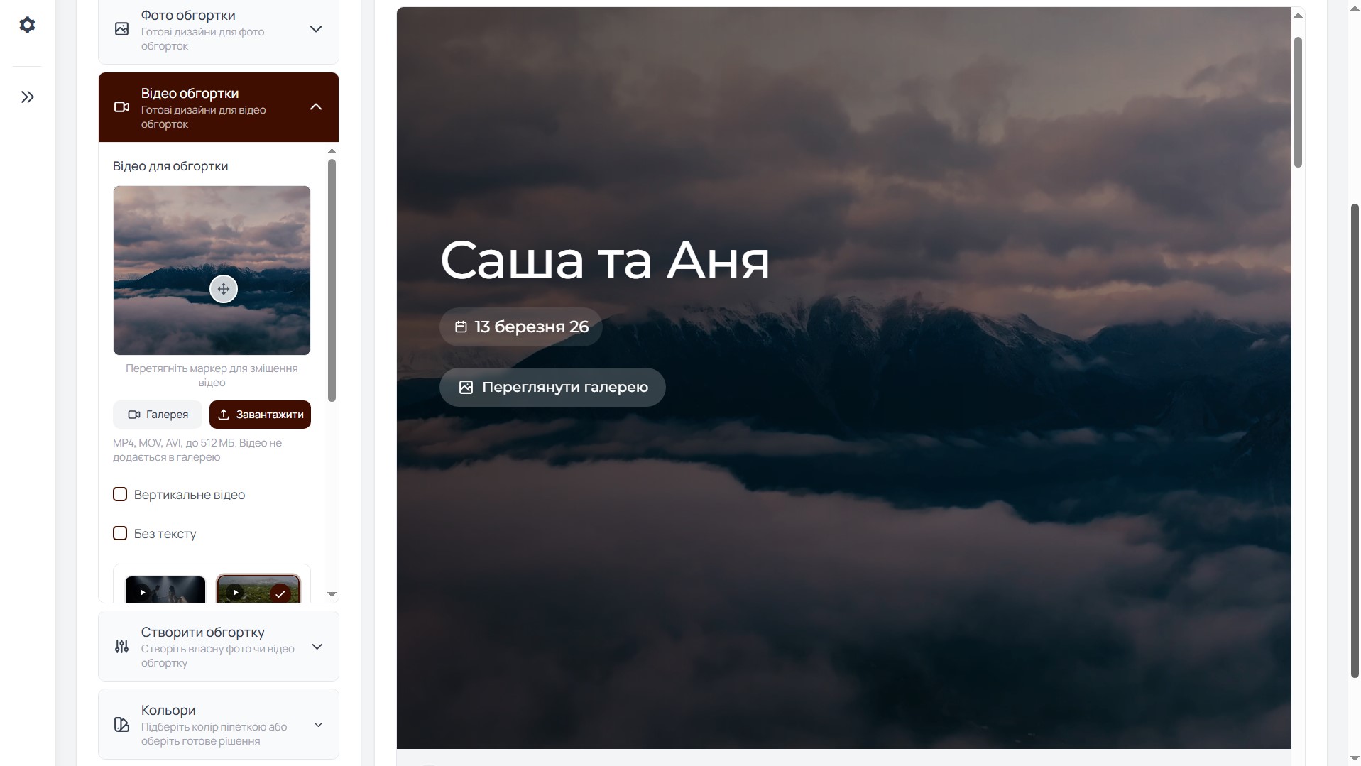 Завантажуй фото (JPG, HEIC, HEIF) та відео (MP4, AVI, MOV).* Створюй власний дизайн для кожної зйомки. Обирай фото- чи відеообгортку і надсилай замовникам.